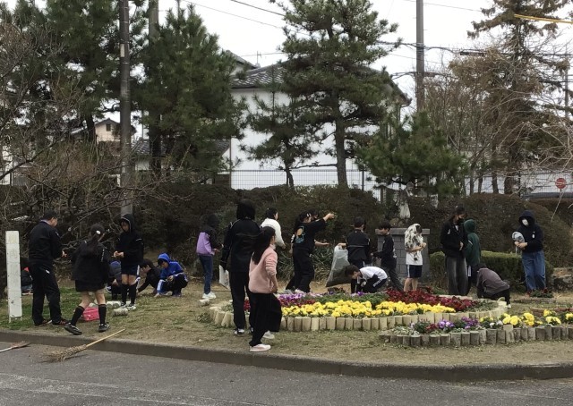 花壇の花も、鉢花も、卒業を祝う気満々です。