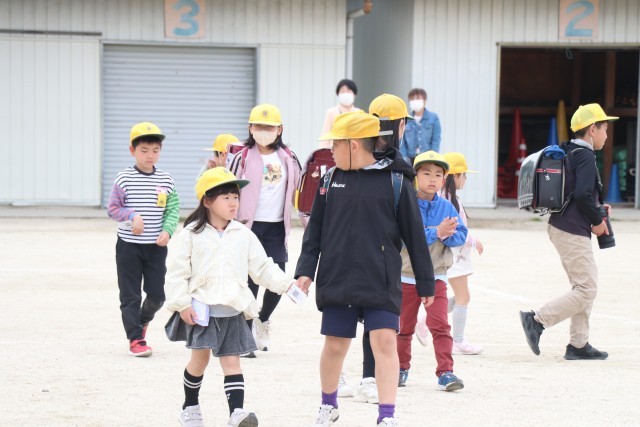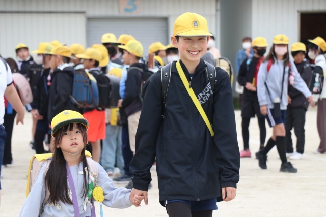 下校集会では、まだ集合場所がわからない1年生をお迎えに行きます。4月中に集合場所を覚えてもらおうと、場所の目印や、友達の顔を覚えてもらえるよう説明する姿が見られました。登下校では、1年生に気を使い、歩くスピードを調整しています。学校のヒーローズとしてさまざまな場面で活躍しています。