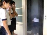 煙で充満した教室を歩きます。暗幕を引いて暗くなっています。姿勢を低く、口をハンカ...