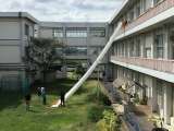 3階から救助袋を使って避難します。救助袋には足から入ります。