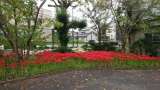 押しボタン式の信号機近くの門で、彼岸花が咲いています。道路から見ることができま...