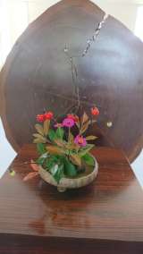 養護教諭が学校の花壇に咲いている百日草を中信にして生けました。