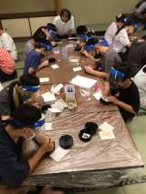 後半クラスの漆器の加飾の様子です。 見本を見て真剣に行っています。