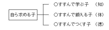 豊田市学校教育目標をふまえ、地域の長い歴史の中で築かれた「すすんで」の気風を受け継ぎ、知・徳・体の調和のとれた人間性豊かな児童を育てる。