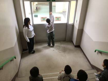 明日の避難訓練に向けて、特別支援学級の子どもたちが避難の練習をしました。まずは、地震が起きた時の姿勢です。机の下に潜ってダンゴムシのように丸くなりました。次に、防火扉を通ったり、普段使わない扉の鍵を開けたりして、建物から避難する練習をしました。火災場所によって避難のルートが変わることも確認しました。明日の避難訓練では、落ち着いた気持ちで真剣に避難しようと気持ちを高めていた子どもたちでした。
