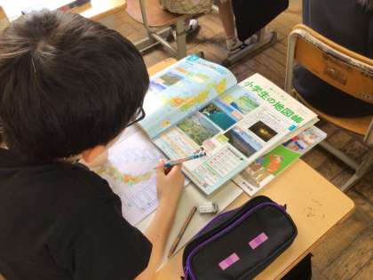 現在、社会科の学習では「国土の地形と特色」について学んでいます。日本にある様々な山脈や川について資料集を使って調べてみると、「こんなにたくさんあるの!?」と驚いている様子で、一つ一つ丁寧に調べていました。
