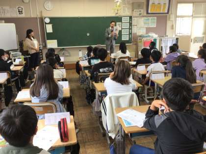 外国語科の学習では、初めて出会うALTの先生の話を興味津々に聞いていました。もちろん英語で話されるので聞き取るのは大変ですが、イラストを上手に織り交ぜながら話したり、適度に日本語に通訳したりしてくれるので、どの子も理解できてとても楽しい時間になりました。