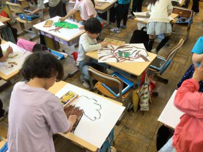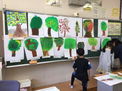 みどりを描く会3 公開日 2025/05/08 更新日 2025/05/08 特色ある学校づくり推進事業 だんだん日差しが暑く感じる時間になってきました。教室に入り、落ち着いて色を塗っている子もいます。校庭で続きを描いている子もいます。早くも、1年生は完成した子の作品が黒板に貼られていました。「先生見て」と得意げに声をかけてくれました。2年生も下絵が終わり、クレヨンで色を付け始めました。3年生以上は、学年が上がるにつれて絵の具の使い方に工夫があることが伝わってきます。