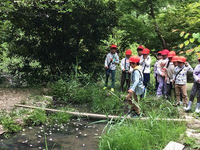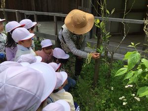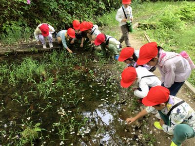 5月15日(木)、バスに乗ってトヨタの森へ行ってきました。森の中ではいろいろな葉っぱを触ったり、その匂いをかいだりしました。また、池ではオタマジャクシを見つけ、捕まえたり、触ったりしました。初めてのことも多く、子どもたちは体いっぱい自然を感じることができました。