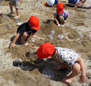6月4日(水)の1、2時間目に、図画工作科の学習で砂でいろいろな形を作る活動をしました。子どもたちと「1年1組のまち」を作ろうと決め、自分たちが作りたいものを考えました。山やお城や川を作りたい子もいれば、お団子やケーキを作りたい子もいました。砂場では、プリンやゼリ−のカップやバケツを使って、一生懸命自分がイメージする形を作りました。この学習の最後に「みんなと協力して作って楽しかった」「自分が考えたものが作れたのが楽しかった」等感想を伝えました。子どもたちにとってとても楽しい学習となりました。
