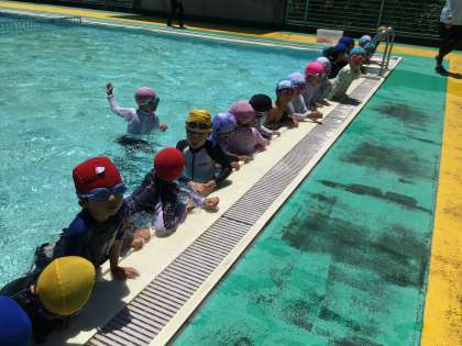 6月5日(木)に、待ちに待った1、2年のプール開きを行いました。水泳学習では、安全に楽しく行えるように事前に学習しました。ルールを守らないと命に関わること危険な授業となることを指導し、どの子も真剣に聞く姿が見られました。実際に入水して行く際は、2年生が見本を見せました。その後、顔を水に付けたり、もぐったりと楽しく水に親しんでいくことができました。これからの水泳指導もルールを守り安全に楽しく行っていきたいと思います。