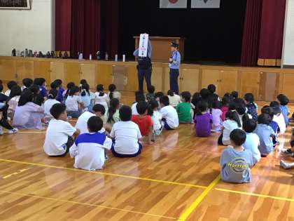 6月18日、豊田警察署員の方にご協力いただき、不審者対応避難訓練を行いました。今回は、6年生が体育館で活動しているときに、不審者(警察署員)が侵入したという想定で実施しました。6年生児童は担任の指示に従い、非常事態を職員室に知らせ、決められた教室に避難することができました。緊急放送を聞いた他の学年の児童も、教員とともに教室で身を潜め、不審者に居場所を気づかれないようにしました。また、男性教員が連携し、児童がいる教室に不審者を近づかせないよう、さすまた等を使って不審者と対峙しました。駐在所の警察官が到着し、不審者が取り押さえられて訓練は終了しました。訓練のあとに全校児童が体育館に集まり、警察署員の方のお話を聞きました。訓練中は、どこに子どもがいるかわからないほど静かに待機できたことを褒めていただきました。また、「つ・み・き・お・に」の約束を学習したので、ご家庭でも話題にしてみてください。