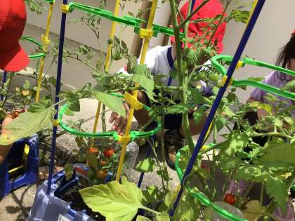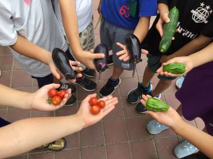 生活科「ぐんぐん育てわたしのやさい」の学習で、5月の半ばに野菜の苗を植えて約1か月。花が咲き、実がつき、つるが自分の背より高くなったりと大きく成長してきました。観察をして行くと、嬉しいことばかりではなく、困ったこともありクラスで話し合いました。グループごとに、困ったことを話し合い解決方法を調べました。インターネットや図鑑、野菜を育てている人に聞いたりと大切な野菜の解決策の為にどの子も一生懸命に調べています。早速、調べた虫よけスプレーを家庭で作り持ってきた子もいます。そして、今週に入りぐんぐん大きく育ちきゅうり、ピーマン、ナス、ミニトマトと収穫を出来た子がいました。是非大切に育てた野菜を、家族で食べてください。