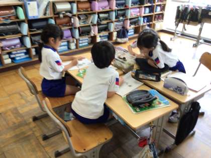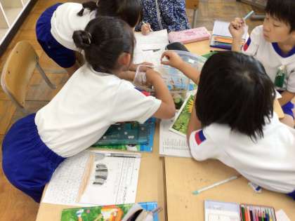 生活科「生き物の発見」の学習で、グループに分かれて、ダンゴムシ、トカゲ、カタツムリを育てています。生き物のためのすみよい環境を作るために本やインターネットを使い調べ学習をして、「素敵ハウス」を作りました。そして、生き物の観察をして行く中で、普段何気なく見ていた虫たちの新たな発見がたくさんありました。「カタツムリは、通った所に白い液の跡がつく」「トカゲの喉のあたりが膨らんだりする」「ダンゴムシの背中に黄色の点々がある」などです。生き物の身体の特徴や、変化、成長に興味津々です。飼育活動を通して生き物に対する親しみと生命を大切にする思いが育っています。