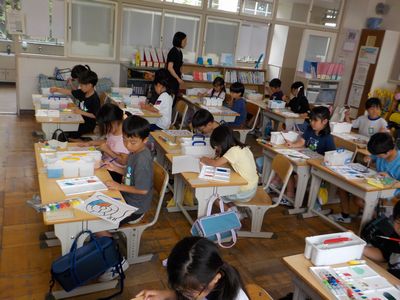 7月2日(水)、図画工作科の学習で、絵の具を使ってカタツムリの絵に色を塗りました。パレットや水入れの使い方を知り、パレットに出した絵の具を混ぜて色を作りました。子どもたちは「こんな綺麗な色ができた」や「こんな変わった色になった」と、混ぜてできるいろいろな色を楽しんだり、できた色に驚いたりしていました。みんなのカタツムリの絵を見て、「みんないろいろな色を使っていいね」と感想を伝え合いました。