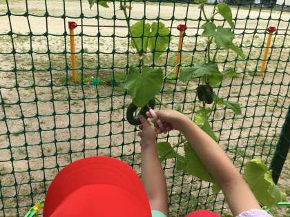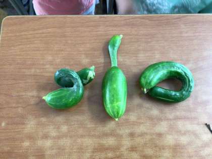 【2年】おもしろきゅうり大集合 公開日 2025/07/07 更新日 2025/07/07 各学年から 生活科の学習で育てている野菜が、おもしろい形で収穫出来ました。お店で見るような長いきれいなきゅうりばかりでない形であり、子どもたちで名前をつけました。「くねくねへびきゅうり」「ボーリングのピンきゅうり」「ひらがな(つ)のきゅうり」です。クラスみんなで大笑いしながら、野菜作りの楽しさを感じた一コマでした。