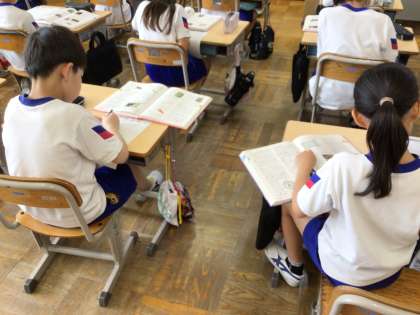 先日司書の先生に百科事典の使い方を教わりました。子どもたちは、国語辞典よりも詳しい内容が載っている百科事典に驚いていました。使い方を聞いた後は、実際に百科事典を使い問題を解きました。みんな積極的に問題を解こうと一生懸命百科事典で調べていました。