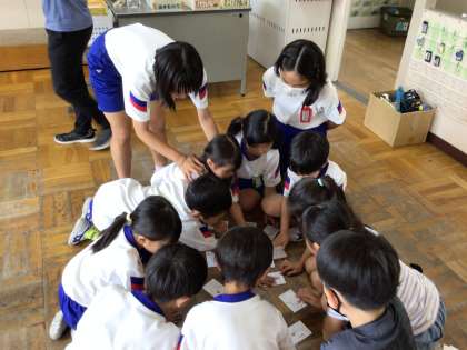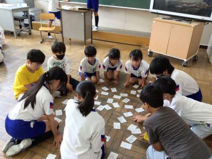 7月8日のふれあいタイムで、みどりのカルタ取りをしました。6年生が読み札を読み、その他の学年はカルタ取りを楽しみました。力の差を考えて、学年別にグループを分けたり、ハンディを付けたりするなどして、どの子も楽しめるようにと、リーダーである6年生が考えてくれました。1年生でも木の名前を読む前に札が分かる子がいて驚きました。さすが「みどりの学校」の子どもたちです。活動の振り返りでは「楽しかった人は手を挙げてください」という6年生の言葉に、全員の子が手を挙げていました。