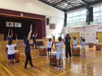 9月16日に、3〜6年生の音楽の学習として「松平和太鼓」の体験をし、和楽器に親しみました。足を開いて体を安定させ、腕を軽く伸ばし、しっかり握ったばちを力強く太鼓の面に打ち付けることを教えていただきました。リズムよく太鼓を打つ途中に掛け声も入れて、子どもたちの姿もさまになっていました。また、太鼓を打つと反対の面が震えていることや、体育館の床にも響いていることを体感しました。郷土の音楽に触れるよい体験学習になりました。