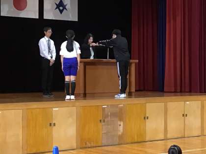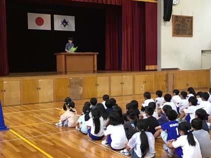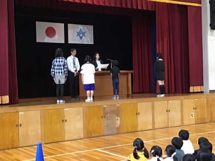 10月10日に全校集会を行いました。青少年赤十字リーダーシップ・トレーニングセンターに学校の代表として参加した児童のスピーチでは、他の学校の仲間と共に過ごした思い出と、そこで学んだことについて発表しました。みんなを大切に思うこと、仲間と仲間をつなぎ前に進めることがリーダーシップであると全校のみんなに伝えました。また、夏休みの課題として取り組んだ生活作文や詩、読書感想文の表彰がありました。たくさんの子が賞状をいただきました。