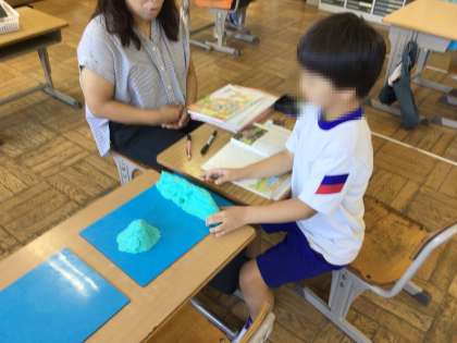 あべまき学級の2年生は、国語科「ビーバーの大工事」の学習をしていました。ビーバーが作るダムや巣について読み取ったことを粘土や爪楊枝を使って表し、理解を深めていました。