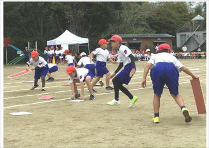 全校のトップをきって、3・4年生が登場しました。最初は、徒競走「ゴールめざして 走り抜け!」です。60mの距離を全力で走りました。次の競遊「めくって、めくって、めくりまくれ!」では、自分たちの色のパネルをできるだけ増やそうと、がんばりました。結果は接戦で白組が勝ちました。最後の表現「伝統と創造 踊れ!舞え!九久っ子」では、地域に伝わる松平音頭とソーラン節を踊りました。掛け声もそろっていて、格好よく踊れました。