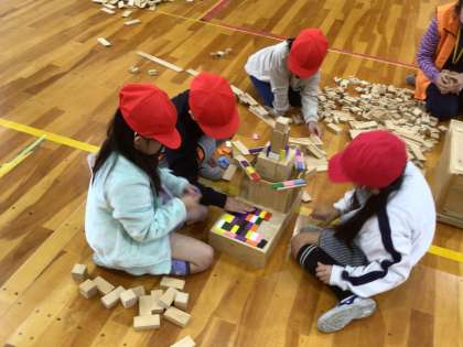 11月5日(水)、豊田市環境学習施設「エコット」の方に来ていただき、森林が健康になるには間伐が必要なこと教えていただきました。さらに、その間伐材から作った積み木を使って、自分たちが作りたいお城やタワーを友だちと協力して作りました。子どもたちは、「みんなで作ったのが楽しかった」と感想で伝えました。