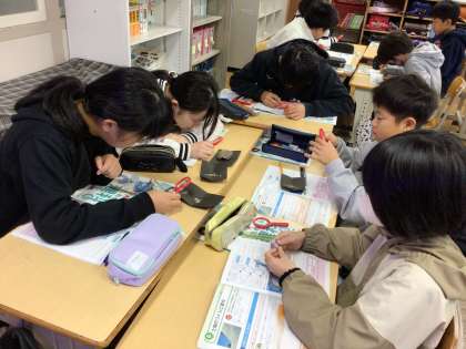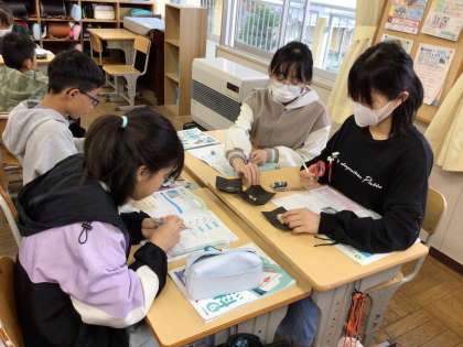 地層の学習で、化石を観察しました。動物なのか、植物なのかも明かさずに配られた化石をひたすらに観察して、気付きを集め、何の化石かを予想しました。虫眼鏡をじっくりとのぞいて、真剣に観察できました。