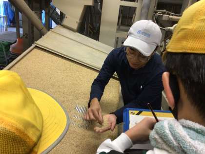 私たちが見学した時は、ちょうどもみすりをして、選別作業をしている所を見ることができました。自分たちがソフトボールを使って手でもみすりした経験を思い出し、機械のすごさに感動しました。