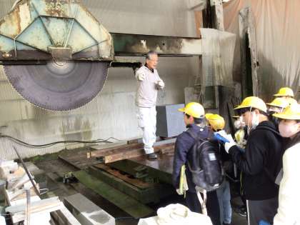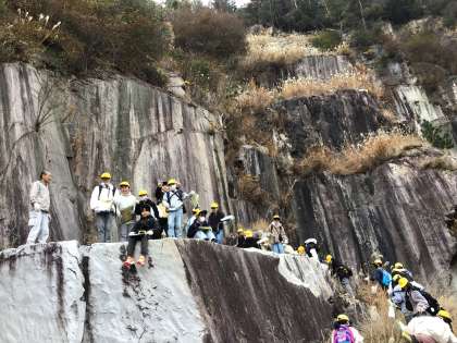 【6年】理科の授業〜花崗岩を学びに採石場見学〜 公開日 2025/12/09 更新日 2025/12/09 各学年から 松平地区の多くの土地は花崗岩質です。私たちの足元に転がる石の不思議を学びに、花沢町にある採石場を訪れました。石切り場にて花崗岩の原石を見せてもらったり、石材工場にて御影石として加工される工程を見学したりしました。「採掘中の花崗岩の巨石に乗ってみよう!」「石ノミで花崗岩を割ってみよう!」など、刺激的な体験がたっぷりの時間でした。