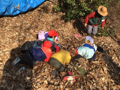 1月19日(月)の午前中、トヨタの森へ出かけ、冬の自然体験を行いました。落ち葉の中に、ダンゴムシになったつもりで潜ってみたり、落ち葉の花火をしたりして落ち葉で思いっきり遊びました。また、カマキリの卵を見つけて触ったり、池で氷を見つけたり、さらに、水の中にいる生き物になったつもりで、池の水に手を入れてその冷たさを感じたりしました。最後にドングリになりきって坂をコロコロ転がりました。どの体験も楽しく、冬の自然を満喫することができました。
