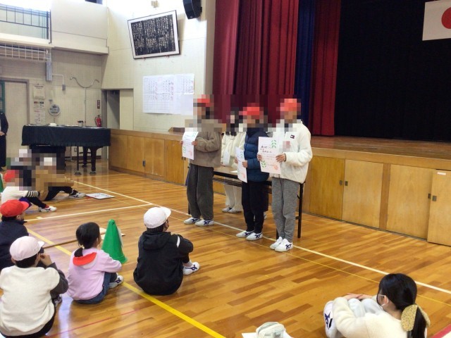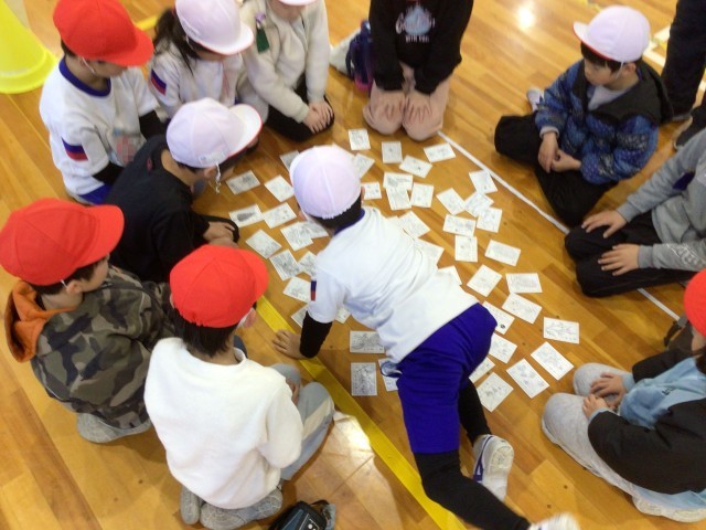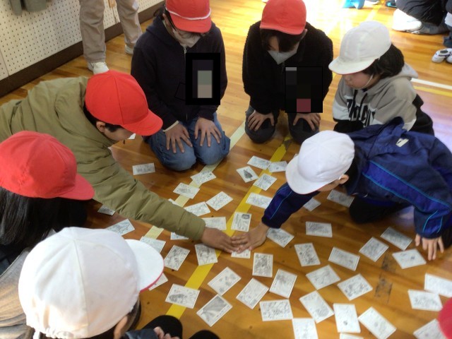 2月9日に全校で「みどりのカルタ取り集会」を行いました。縦割り班対抗で行い、取った札の合計枚数で順位を競います。ドン、ドンという太鼓の合図で読み札が読まれるため、その音を聞くと体育館がさっと静かになり、緊張感が生まれます。カルタが取れるとガッツポーズをしたり、同じ班の子が取ると拍手をして喜んだり、ルールを守って楽しくカルタ取りをすることができました。表彰式では先日に行った「プログラミングカルタ検定」の第13代カルタ取り名人と準名人の表彰も行われました。環境委員の子どもたちと担当の先生の事前準備とスムーズな進行によって、楽しいカルタ取り集会になりました。