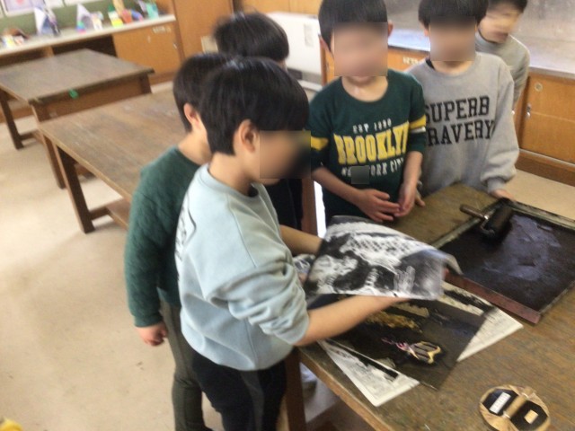 1月の終わりから時間をかけて作った版画の板を刷り上げました。初めての版画インクやローラーを使用して、慎重に刷りました。手や顔が黒くなりながらも、友達と協力して完成することができました。どの子も自分の作品に満足げな表情でした。