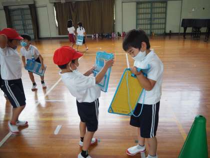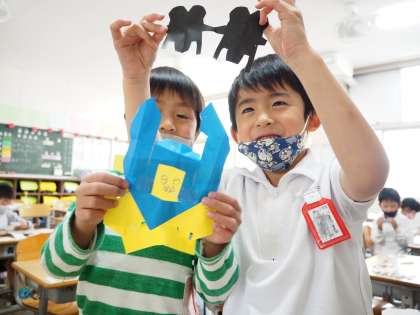 生活の授業の「ともだちとなかよし」の学習で、名刺交換をしました。他のクラスの友だちにも積極的に名刺を渡しました。