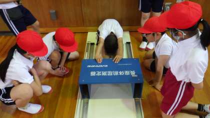 4年2組「体力テストの練習」今年度増えた種目のうち、長座体前屈の練習をしている様子です。他にも反復横跳びも練習しました。お家の方とも一緒に練習してみてはいかがでしょうか。