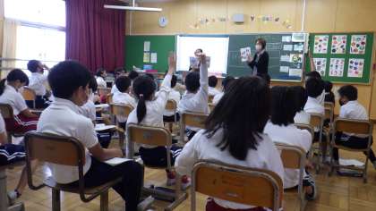1組は、英語での様子です。ALTの先生と元気よくあいさつをし、ゲームやアクティビティを楽しんでいます。
