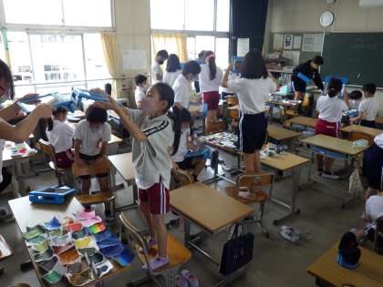 2組は、図工「色あい ひびきあい」の鑑賞の様子です。グループの子全部のカードを話し合いながら並べた後、一番いい角度を探して写真に収めています。