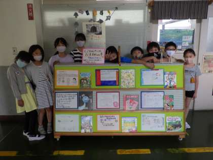 2組は、国語「たしかめながら話を聞こう」の学習で、低学年の子に紹介する本を選びました。おすすめの本について話してもらい、メモや質問をし合ったりして、グループで1冊の本を決めました。図書室の前に展示してもらいました。
