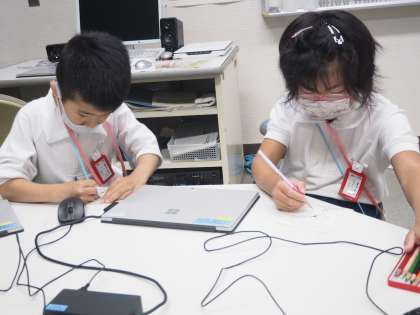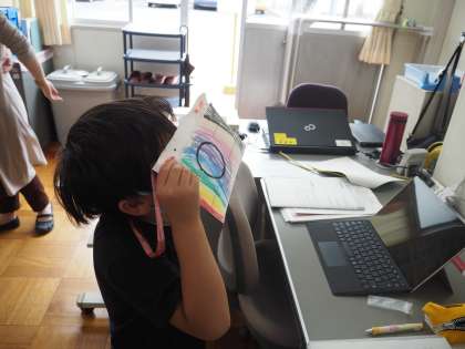 生活科の学習で、学校探検に出かけました。今までに行ったことのない理科室やコンピュータ室などの特別教室に足を踏み入れると、「理科室には、実験の道具があったよ」「コンピュータ室のカーテンは緑色だよ」などと、新しい発見をいっぱいしています。6年生がボランティアで作ってくれたクイズにも積極的に挑戦し、探検地図と手作りの探検カメラを携えて、意気揚々と楽しく探検しています。