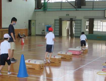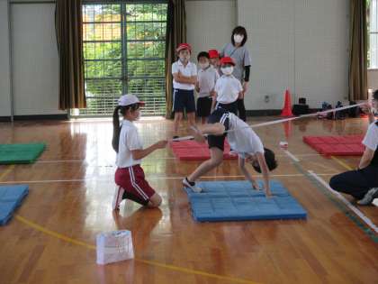 体育の時間では高跳びとマット運動をしています。跳び箱の最上段やゴムひもなどを使って跳ぶ学習をした後、実際に高跳びのバーを跳びました。また、マットやゴムひもを使って側転の学習も行っています。