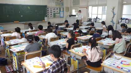 図画工作でカラフルなカタツムリをクレヨンと絵の具を使って描きました。子どもたち自身で5色を選び、どんなカタツムリにしようか一生懸命考えました。