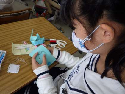 家庭科の様子です。玉結びや玉止めが上手になってきています。今回は小物作りに挑戦しました。ボタンや絵柄をつけることを頑張りました。
