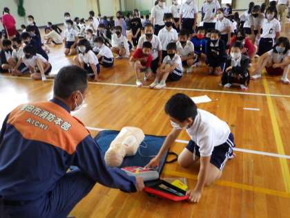 6月14日(月)、豊田市消防本部の方を招き、応急手当講習会を行いました。初めて行う心肺蘇生法やAEDの器具を使った活動に緊張感をもって取り組みました。