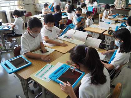 1組は、国語「ことわざ・故事成語」でクイズを授業参観でだせるように、班で役割分担をして調べました。難しい由来の故事成語が多くて苦戦した様子も見られましたが、一生懸命取り組み、クイズも成功させることができました。