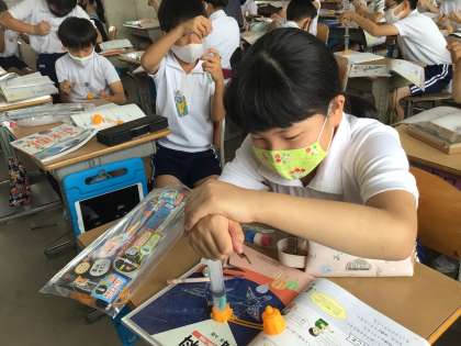 2組は、理科「とじこめた空気や水」で、ピストンを押して、中に閉じ込めたスポンジのペンギンを縮ませている様子です。このことから、空気も縮んでいることに気付きました。この後、空気鉄砲でも楽しみました。