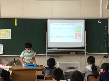 3組は、総合「SDGs」で、コンビニや飲食店、トヨタ自動車などの身近な企業が取り組むSDGsの活動を調べ、プレゼンを行いました。iPadを使いプレゼンする姿。カッコいいね!