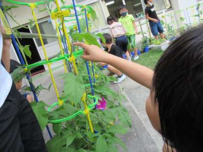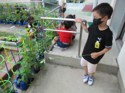 5月に種を植えたアサガオが花をつけ始めました。「すごくきれいな花がさいたよ」「ソフトクリームみたいなつぼみが4つもあったよ」「何色の花が咲くか楽しみだな」と毎日水やりをしながら大切に育てています。アサガオの花を使って色水を作ったり、おしばなをしたりと、この先も楽しいことがたくさん待っています。