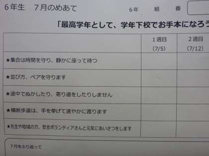 6年生の7月のめあては「最高学年として、学年下校でお手本になろう」です。今月の学年下校はあと5回。チェックシートを使って、お手本になれるように取り組んでいきます。