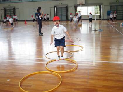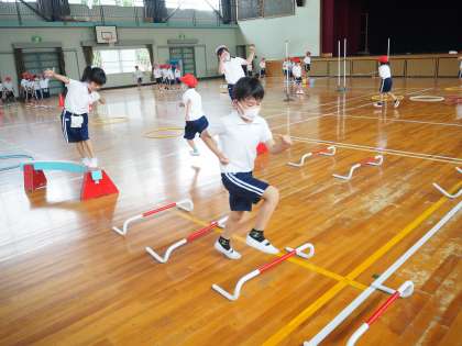 体育科の学習では、ミニハードルやフラフープ、踏切板、ゴムなどのいろいろな道具を使って、「とびあそび」を楽しんでいます。リズムよく跳んだり、高さに挑戦したりして、元気よく活動しています。子どもたちは、体力向上補助員の先生のアドバイスも聞きながら、工夫して取り組んでいます。