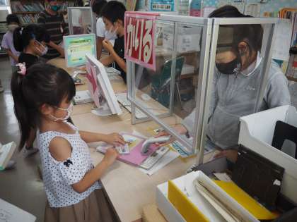 前山小学校では、図書館祭りが開催されています。本を借りるとビンゴカードにスタンプが押してもらえて、とても嬉しそうにしています。ビンゴを達成させて、プレゼントでもらった栞を早速使っている子もいます。図書館祭りを通して、いろいろな本に親しむことができています。